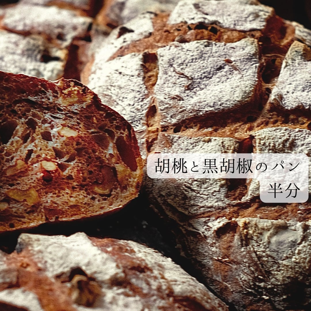 国産有機小麦粉、有機全粒粉、ライ麦粉、有機レーズン酵母で仕上げた生地に、黒胡椒と胡桃を散りばめました。酸味の少ないリーンなパンです。お召し上がり前にリベイクすると焼きたてのような美味しさになります。